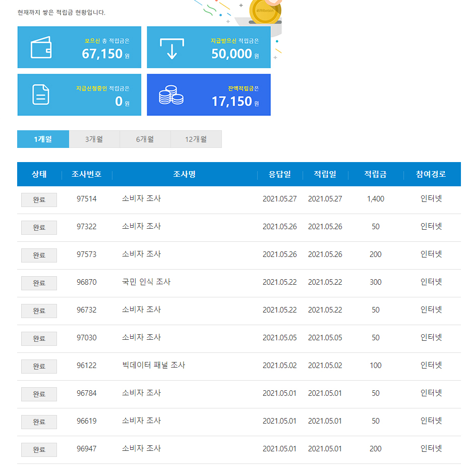 적립금은 조사응답시간과 난이도에 따라 달라지는데 보통 100원~500원 정도의 설문이 많고 크게는 1500원 안팎의 설문도 가끔 있고요.. 보통 한달에 4000~5000원정도 혹은 더 쌓을수있어요.